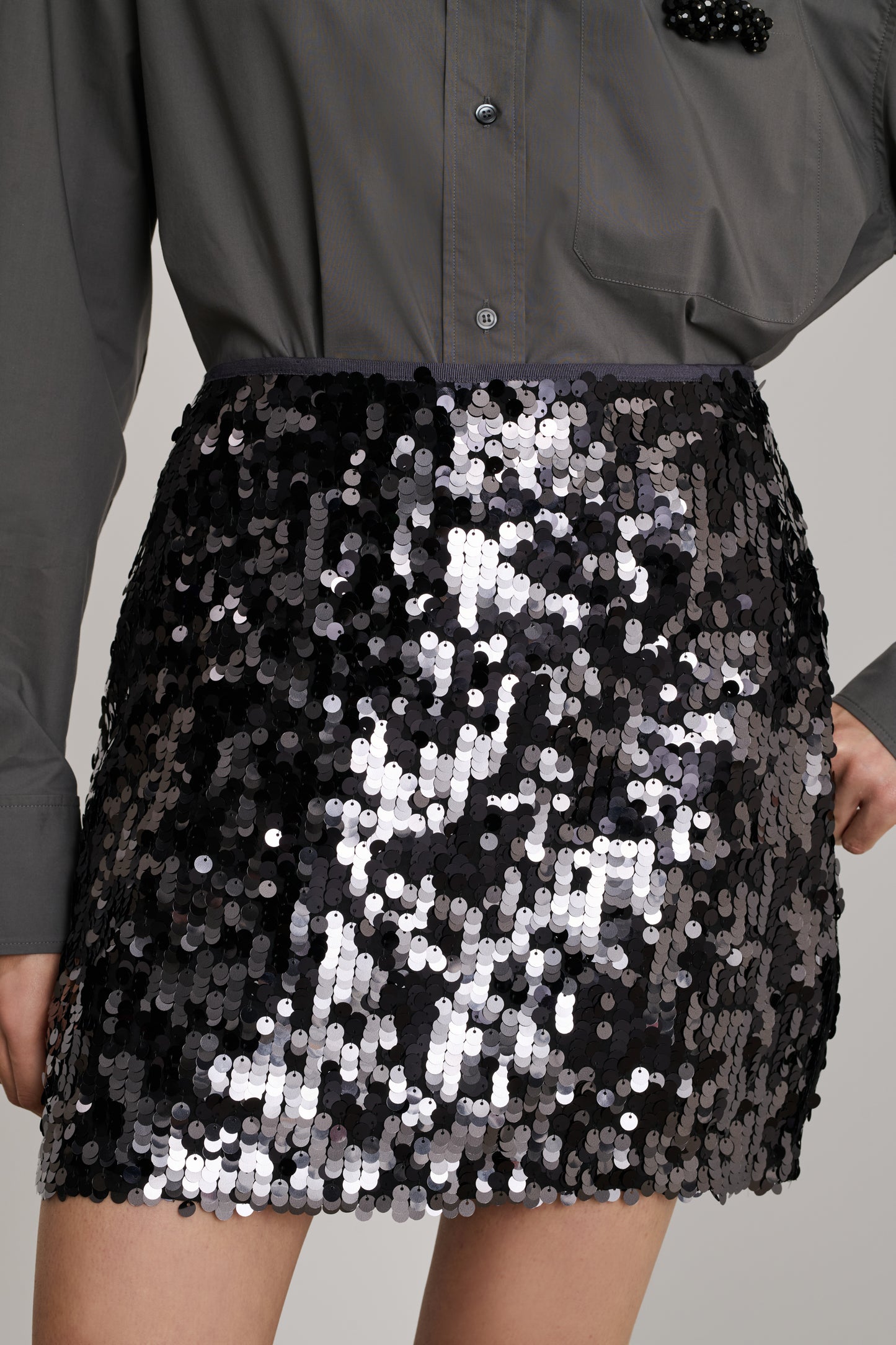 ROBBIE is a short skirt made from a sequinned fabric. Shades of blue and charcoal grey combine to create a unique hue that will enhance your evening outfits. Fully lined, it sits low on the hips. The cut is short and straight.