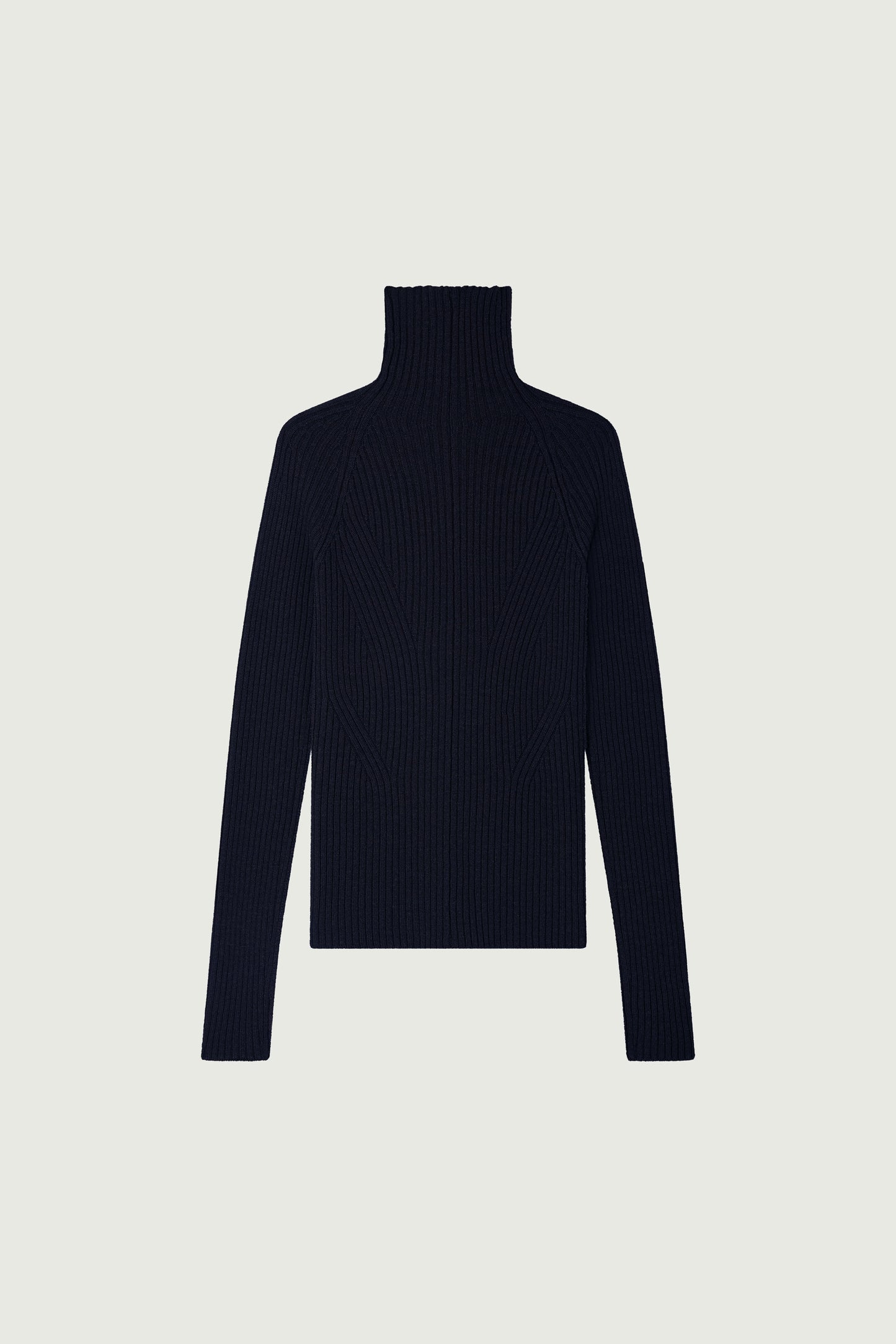 CAMILLE is a high collar jumper, knitted in merino wool yarn. A ribbed effect accentuates the silhouette, while the long sleeves can be worn extended to cover the back of the hand, slightly protruding from the sleeve of a coat.