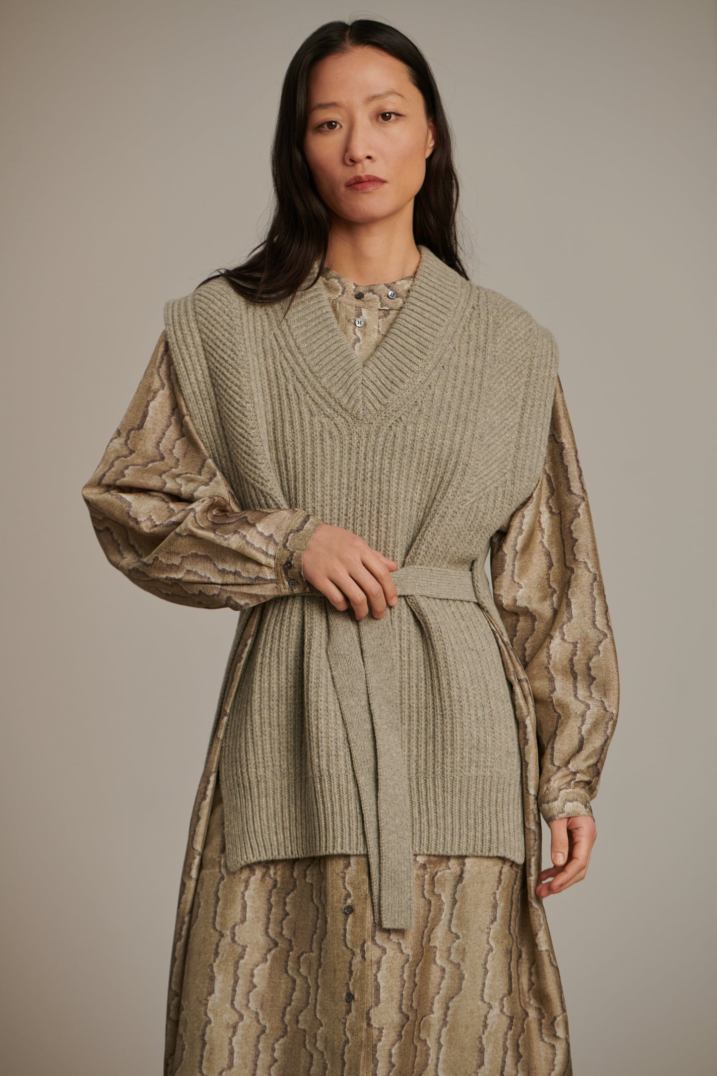 COSTA is a straight bib, knitted in virgin wool yarn. Visual impact is created by a ribbed effect, with ties on the sides that can be worn belted to accentuate the waist or left to hang. This piece is ideal for adding warmth to an outfit, such as a silk dress or a cotton shirt.